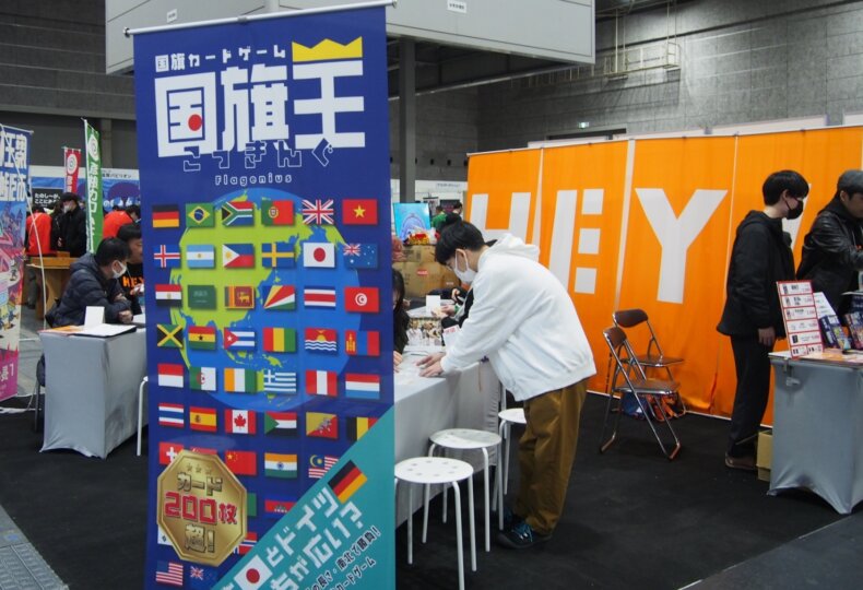 私はBGBE2025でHEY!さんのブースを訪れていて、そのとき試遊した「国旗王」(こっきんぐ)が面白くて、購入しました。この国旗王、アナログゲームでは異例と呼べるほどの大ヒット作品となっています。制作されたのは大阪を拠点に14名で活動しているボードゲーム創作集団「HEY!」さんです。