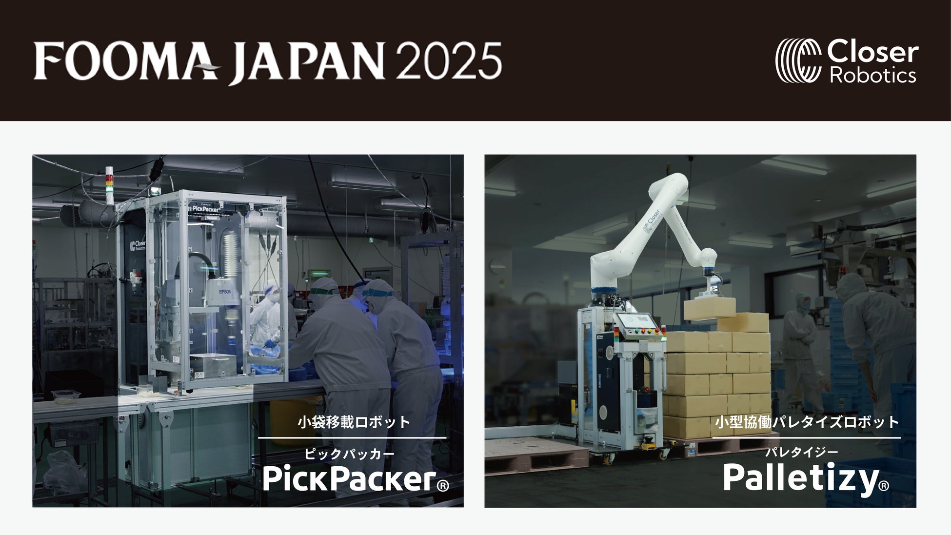 筑波大学発のロボティクス企業クローサーは、小袋移載ロボット「PickPacker(ピックパッカー)」を初公開、マルチライン対応「Palletizy」を参考出展します。めんつゆのような形状が安定しない小袋を毎時1200食の速度で処理する業界最速のバラ積みピッキング技術を実装し、株式会社デリモの惣菜製造ラインに導入されました。食品産業では、個体差や変形のある不定形物の盛付が自動化の壁となってきましたが、クローサーは「小型」「高精度」「高速性」を兼ね備えたシステムを実現。不定形小袋の認識に特化した3DビジョンAIと高度なロボット制御により、省人化と品質の安定を両立しました。(6/2更新)