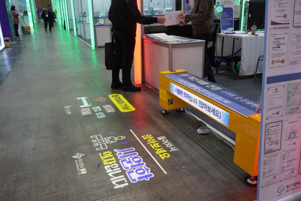 足元に案内を投影するのは韓国でよく見かけます。それにしても鮮やかで明るい。中に入ることを促すような説明がサンプルとして投影されています。