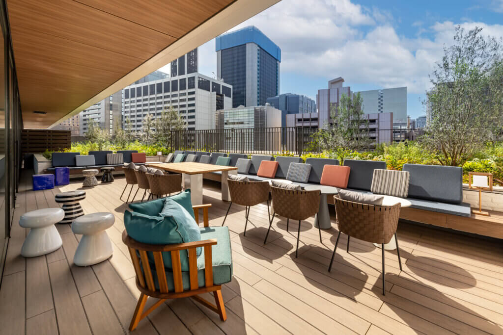 5階には、イタリアのブランド「GERVASONI」の家具を配したテラスラウンジがあります。24時間無料のコーヒーや紅茶。17時〜18時半は「イブニングワインサービス」として赤・白ワインをセルフで。仕事の合間や1日の終わりに、打ち合わせやちょっとした交流の場として活用できます。
