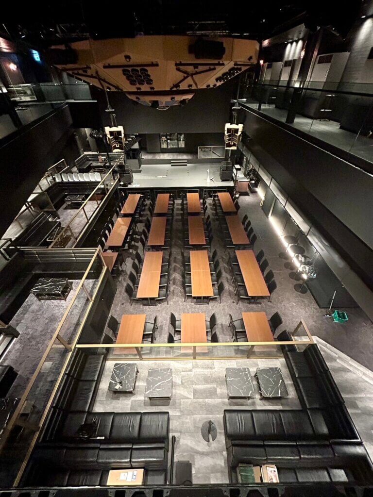 普段はトップアーティストによるライブフォーマンスが行われるライブハウス「BASE GRANBELL」。3層吹き抜け構造で、最大約1,200㎡・天井高約9mの開放感ある造りです。柱がなく、フラット仕様にも変更できるため、レイアウト自由度が高いのが特徴。立食で約500名、着席で150名まで対応し、レセプションやパーティー、表彰式、懇親会など幅広い用途で利用できます。