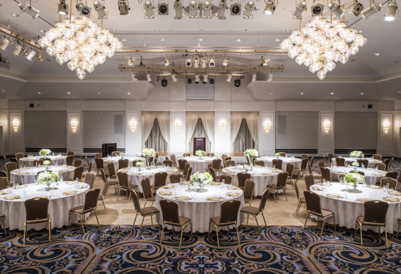 ホテルオークラ東京ベイの強みは、MICE利用に特化した会場のフロア構成です。ホテル内には、ヨーロッパの宮殿のボールルームを彷彿とさせる優美な大宴会場「クラウンボールルーム」をはじめ、分割可能な中会場「ヴィクトリアルーム」、少人数用の「アスコットルーム」など、多様な会場を備えています。特筆すべきは、これらの中小宴会場が、大宴会場を挟んだ向かい側に集中配置されている点です。この設計により、フロア全体を「ほぼ貸し切りのような状態」で利用でき、機密性の高い会議や一体感が求められる大型イベントにおいても、他のゲストを気にすることなく集中できるプライベート空間を実現します。