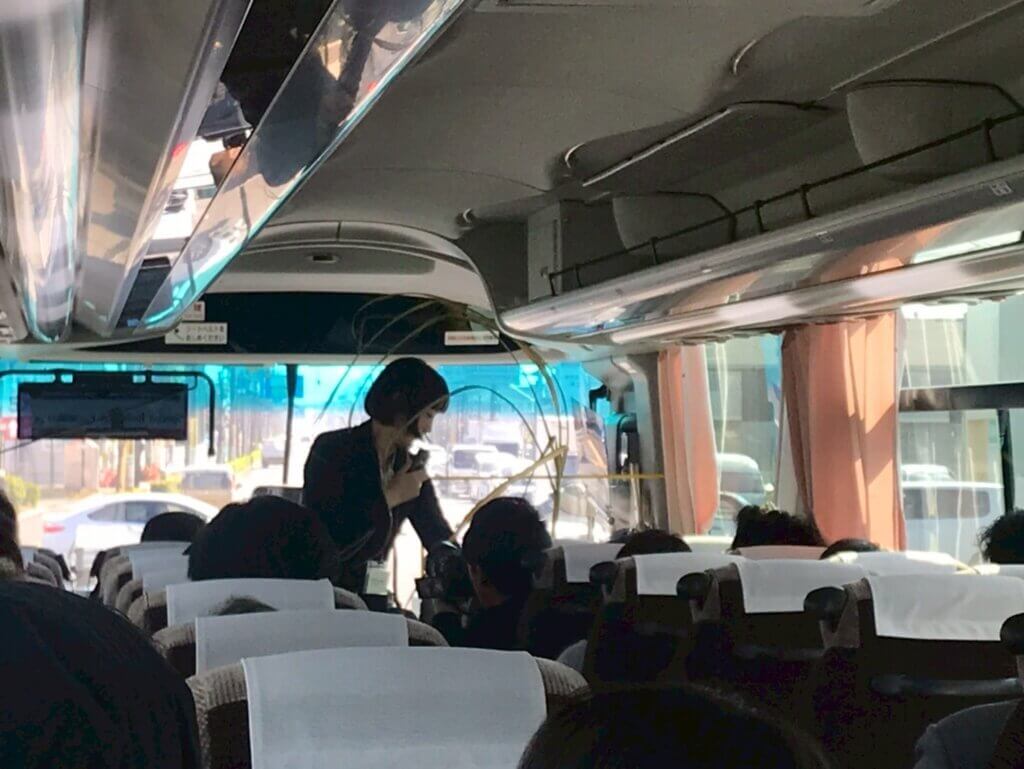 バスの中ではガイド兼通訳を務める今泉さんが