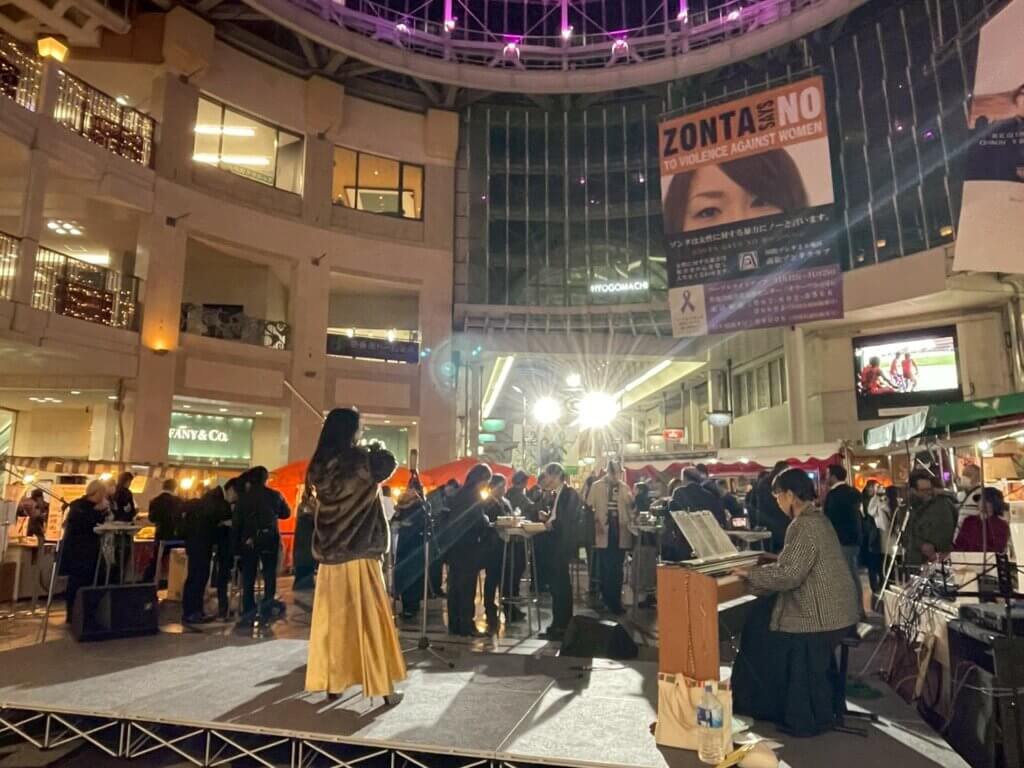フードやドリンクを楽しむ時間がしばらく続いた後、バイオリンのクラシック演奏がはじまり、商店街の空間が、非日常へ。