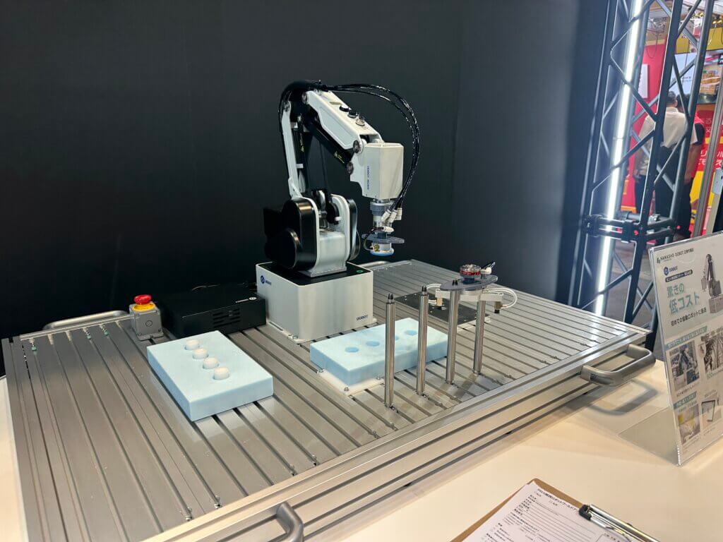ブースで特に注目を集めていた製品の一つが、中国・DOBOT社の協働ロボットです。ロボット単体を40万円台で提供できる低価格を実現しながら、「プログラムが簡単で、子どもでも使えるブロックリー形式」という高い操作性を両立させています。