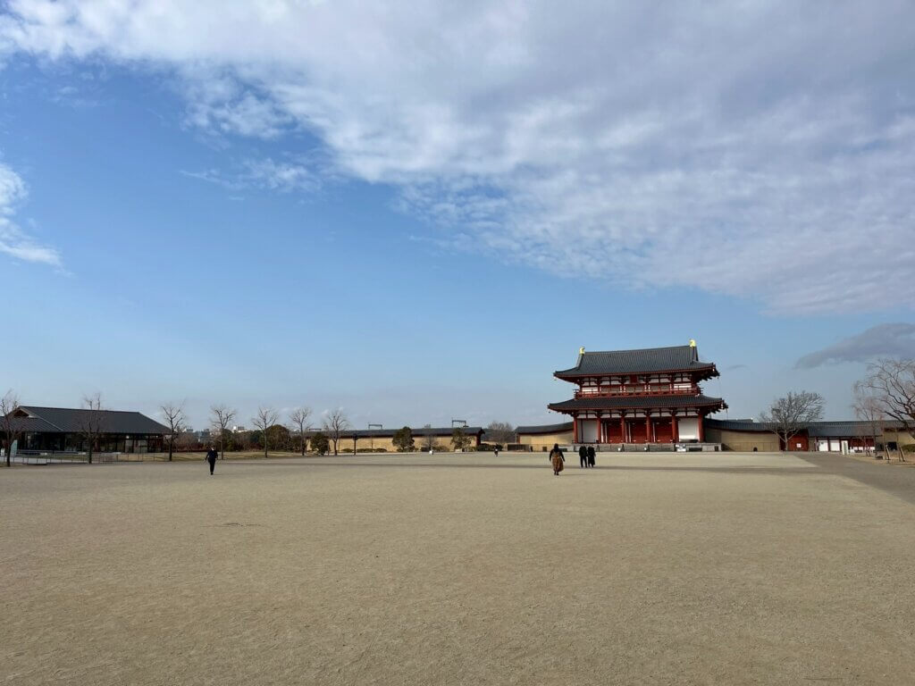 朱雀門の前は広場になっています。この幅が平城京の朱雀大路のものに相当する74メートル!道幅ではないです、もはやグラウンド。