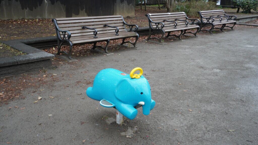 港区の公園には色鮮やかな小さな動物の遊具が。