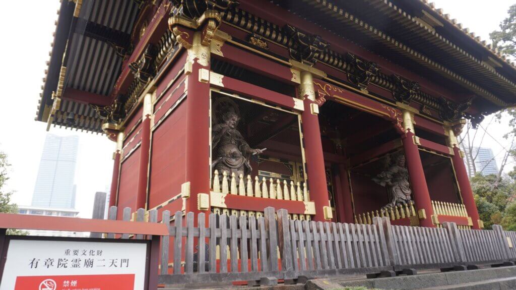 すぐそばで見逃せないのが有章院霊廟 二天門(重要文化財)。七代将軍家継の霊廟建築でしたが、空襲で多くは焼失し、二天門のみが残りました。近年、往時の美しさを取り戻しました。