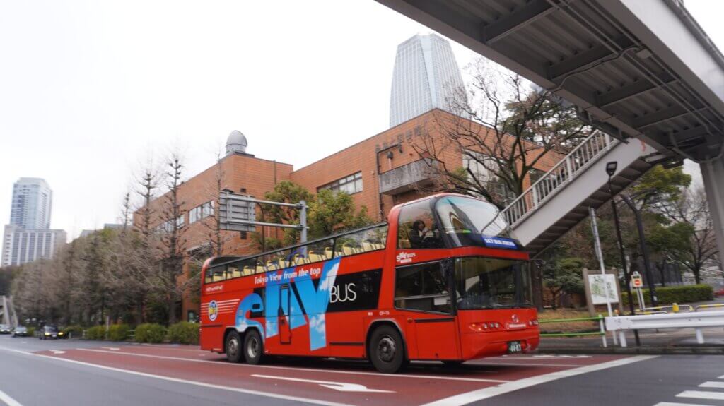 みなと図書館前。午前は雨のためか、二階建てのSKY BUSはほとんど空席です。MICEバスさんぽでもよかったか…?
