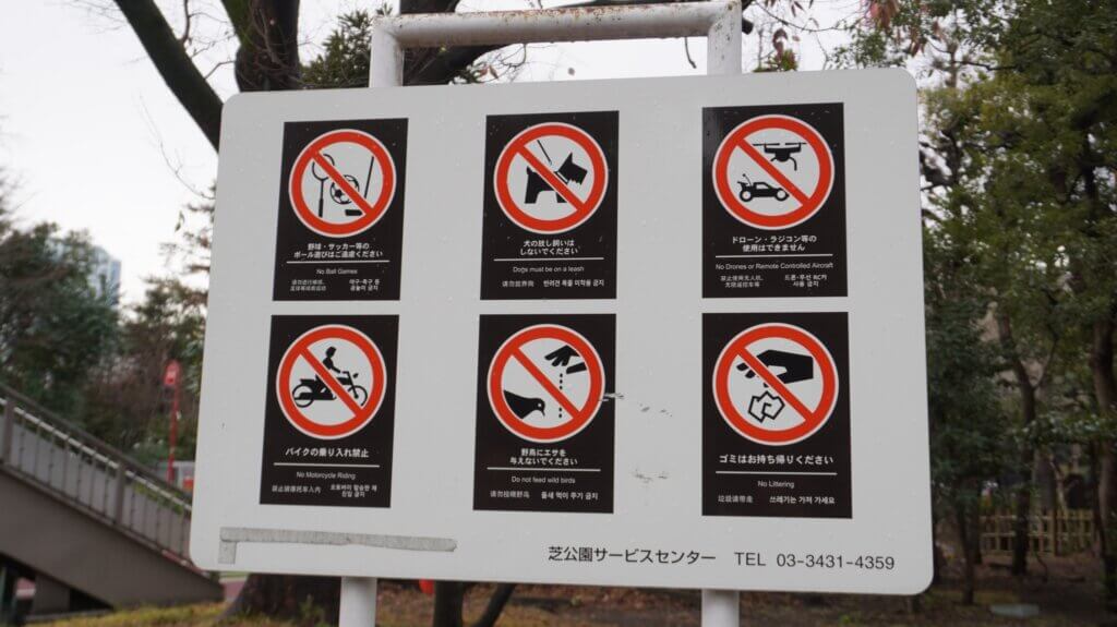 芝公園をさらに歩きます。ラジコン注意はちゃんとアンテナついてて芸が細かい。ハトもかわいい。