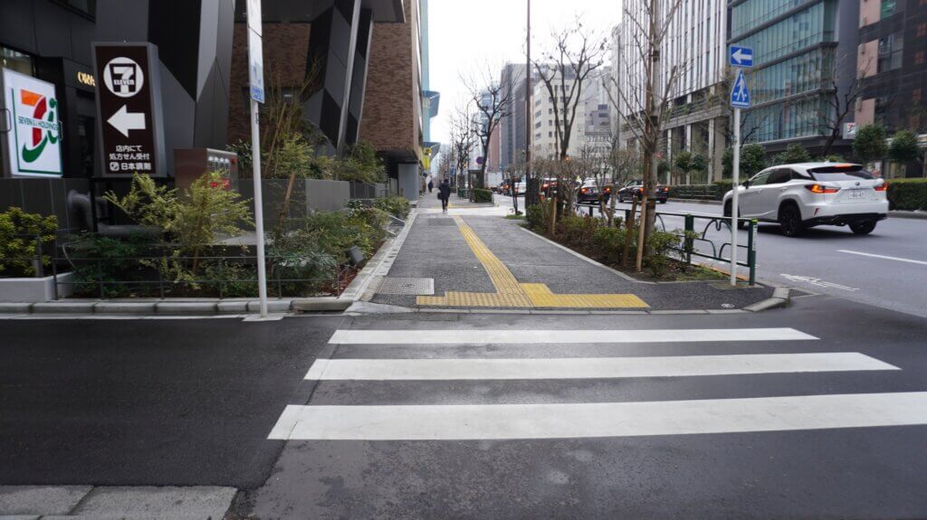 日比谷通りを進むと、短すぎる横断歩道が。ゼブラが3本しかないのです。さらにワンブロックが小さい。地図で測ると15mほどで次の横断歩道です。やはり歩くと面白いものが次々に見つかるものです。