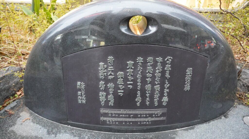 近くにある『銀座の恋の物語』の歌碑。1961年、石原裕次郎と牧村旬子のデュエットで大ヒットしました。タイトルに地名の入った歌っていいですね。最近のヒット曲では少なくなりました。ドリカム『大阪LOVER』くらいしか思い浮かびません。
