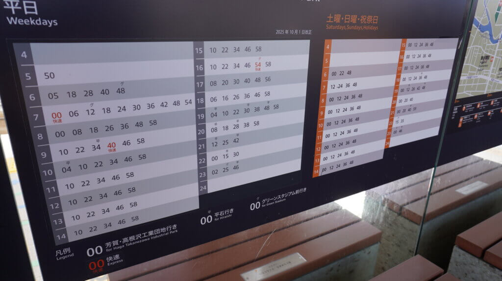 宇都宮駅東口停留所の時刻表。約10分間隔での運行。
