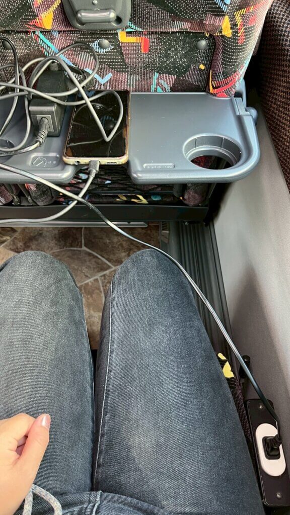 車内はWi-Fi完備、トイレあり。リクライニングシート・小さなテーブル付き。