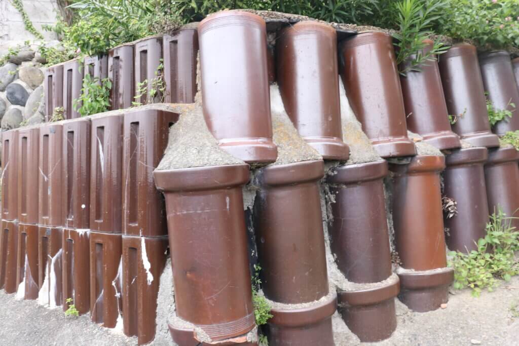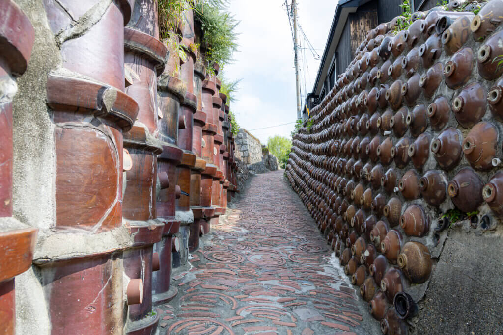 明治期の土管と昭和初期の焼酎瓶で覆われた独特な景観を生み出す坂道です。