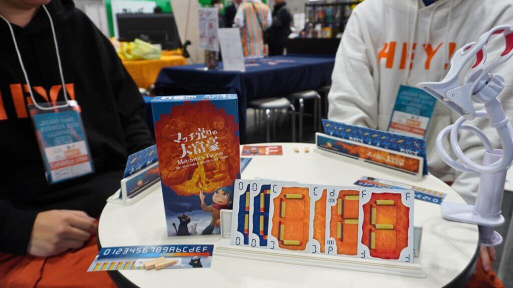 初回から企業ブースで出展されています。人気作品を抱えるだけあり、ブースの様子は安定感があるのはさすがです。遊び方を教えていただいた『マッチ売りの大富豪』は、マッチ棒パズルの要領で手札を変化させられる「大富豪」をベースにしたカードゲームです。2、3回遊べばコツが掴めそうなシンプルなルールですが、トランプで遊ぶものよりうんと戦略性がありそうです。