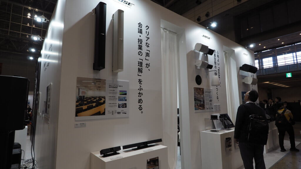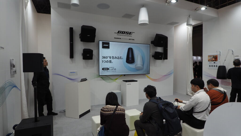 「BOSE PROFESSIONAL」。新製品のペンダント型フルレンジスピーカーの性能を伝えるため、コマをぐるっと囲んで音の聞こえ方を確認。壁沿いに商品を並べるスタイルがユニークです。