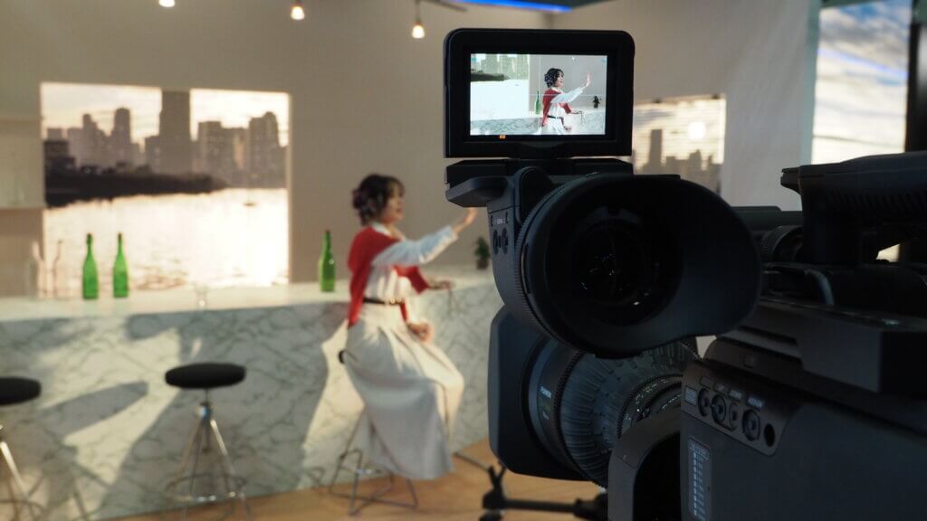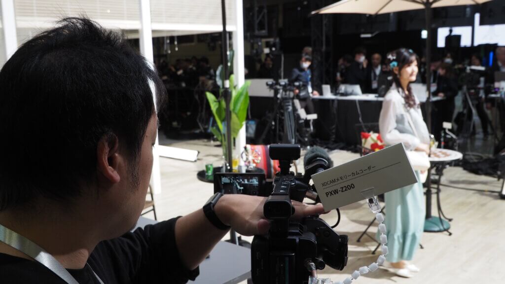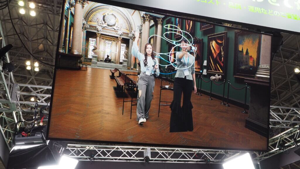 展示されているものは多岐に渡るものの、各社に共通するのは展示方法の工夫です。モデルを自由に撮影できたり、グリーンバックで撮影したものが目の前で編集されたり、実際にカメラを装着して歩いてみたりと、直感的にわかりやすい展示がされています。
