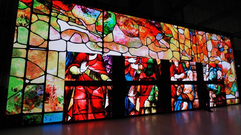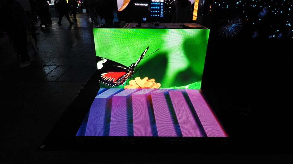 映像技術が伝わるよう、あえて照明が暗くなっています。色鮮やかで、テーマパークの夜のパレードのようなワクワク感があります。