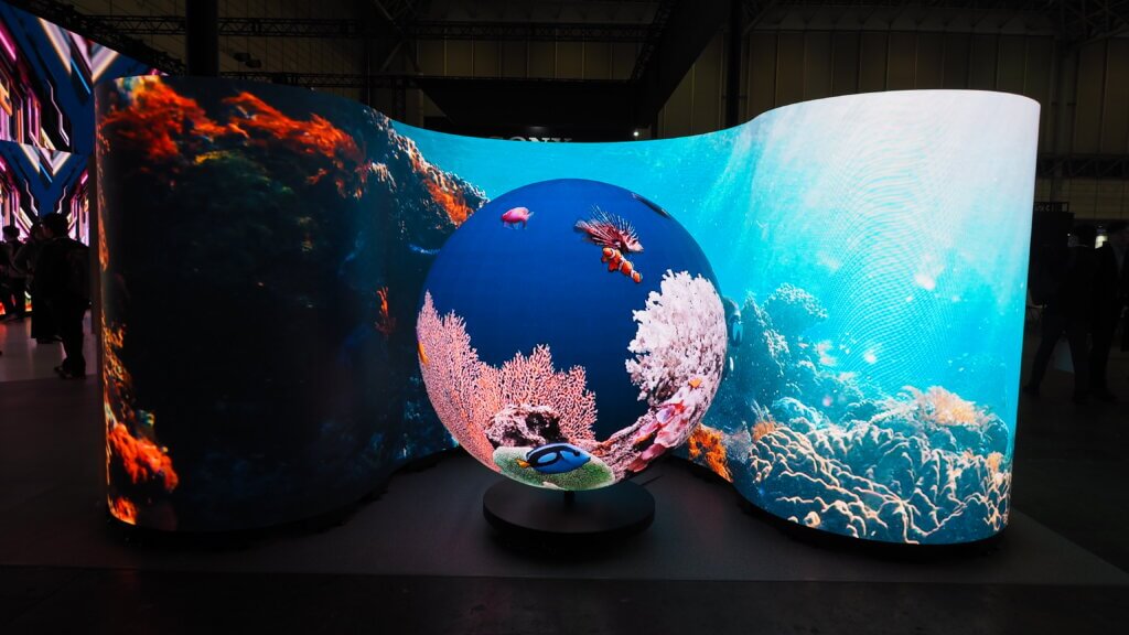 ひときわ目を引く「SONY」のブースには、高さ4m近くあると思われる巨大スクリーン。色彩の美しさに吸い込まれるように、スクリーンに見入る人たちが印象的でした。