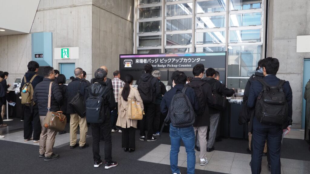 開場時刻の10時に幕張メッセに到着。開催3日目、平日にもかかわらず、続々と来場者が入っていきます。来場者バッジは現地で印刷するシステム。全6カ所にピックアップカウンターが設置されています。ホール6の前のカウンターには100人近い人が並んでいましたが、プリンターが10台あり、スムーズに進んでいきます。