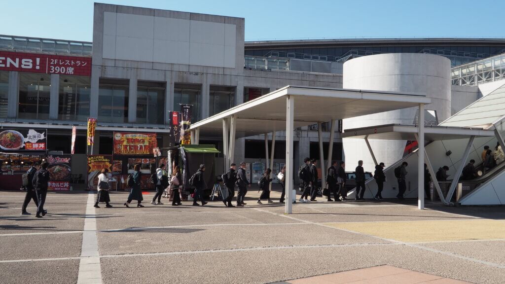 ブースの世界観づくりだけでなく、ホール配置やコマサイズも含めて来場者の動線を考えることが、展示会での集客に大きく影響することを感じさせる事例です。