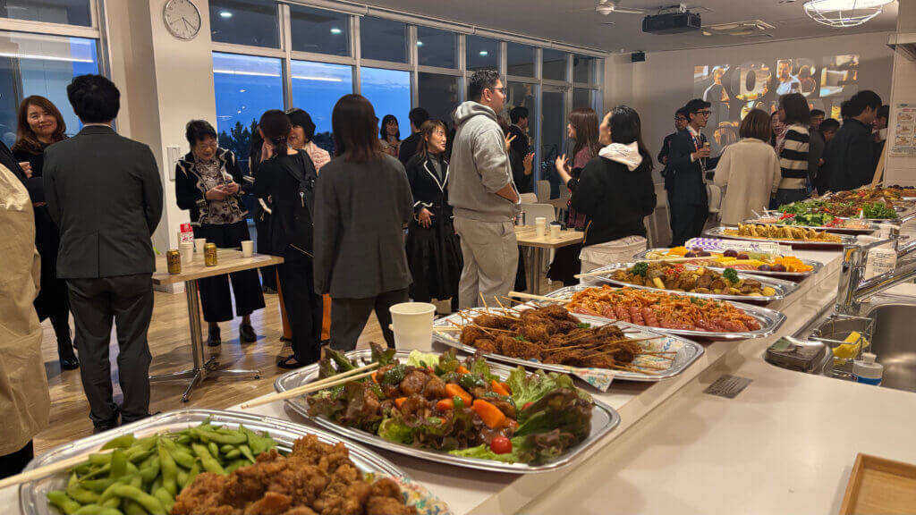 歓談が始まると、外国籍スタッフ同士が話す際にも日本語を使う姿が目立ちました。序盤は、万博スタッフ同士やゲスト同士での再会を喜ぶ声が中心です。万博終了後、スタッフ同士が集まる機会は限られており、「こういう機会に、また皆さんと会えてうれしい」という声も聞かれました。