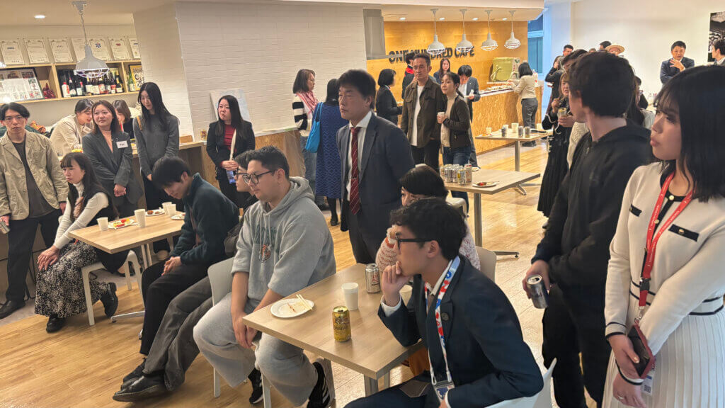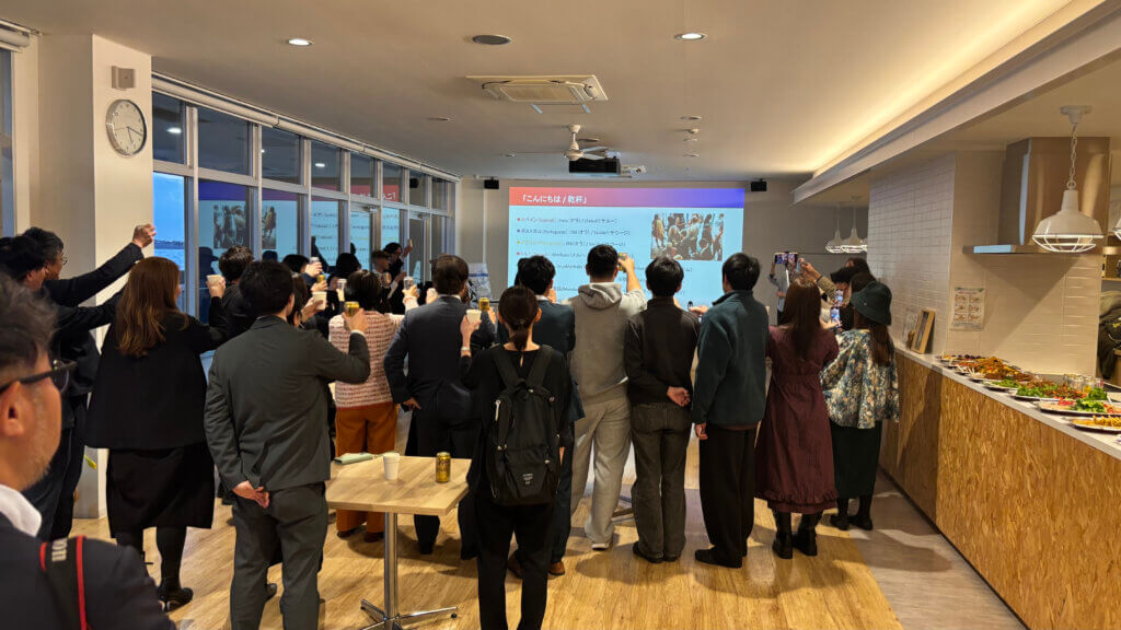 乾杯は日本語だけでなく、ポルトガル語、スペイン語、トルコ語など複数の言語で行われました。万博スタッフから各国のお土産が用意されていたこともあり、初対面同士でも自然に会話が生まれていきます。多国籍でありながら、日本語を共通言語とする点も、このイベントならではの光景でした。