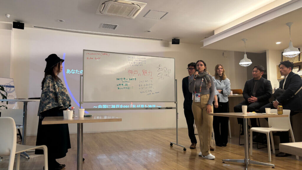 後半に行われた神戸PR企画では、アメリカ、ドイツ、ブラジル、オーストリアなど、さまざまな国籍のスタッフが神戸の魅力を発表しました。その場で考え、ホワイトボードを使って共有します。
