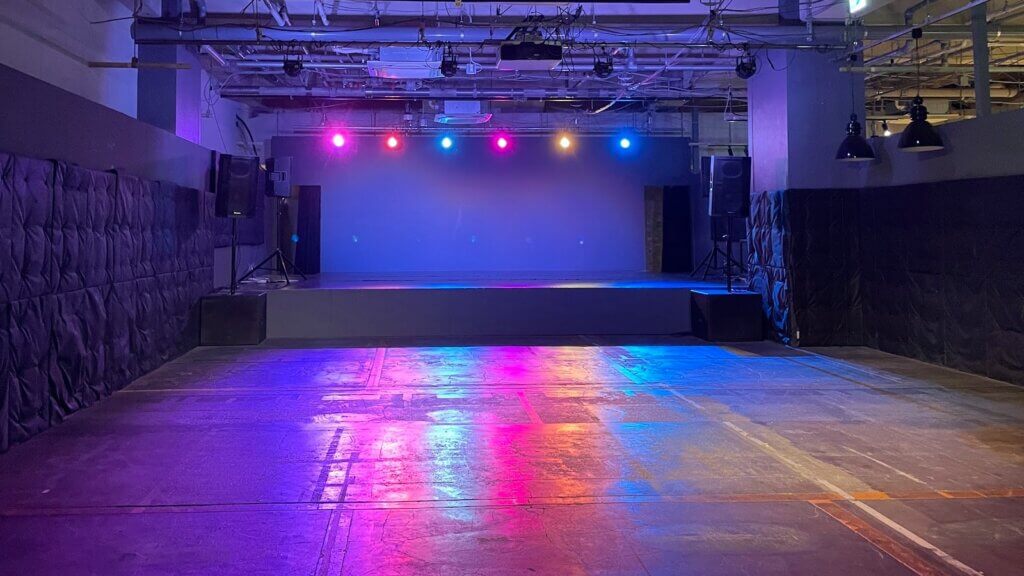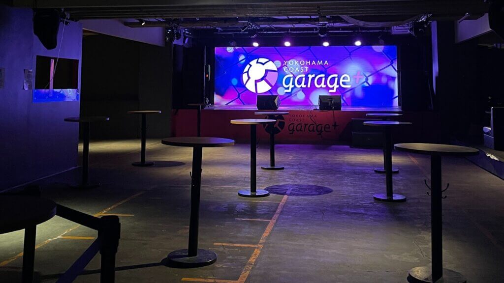 YOKOHAMA COAST garage+は横浜中央郵便局別館の車庫をリノベーションしたイベントスペースです。横浜駅直通の複合型体験エンターテイメントビルである「アソビル」の地下一階で運営されています。最大約800名を収容可能で、横浜駅周辺では最大規模の会場の一つ。コンクリート床には白色や黄色の消えかけたラインがあり、当時の面影が残っていました。