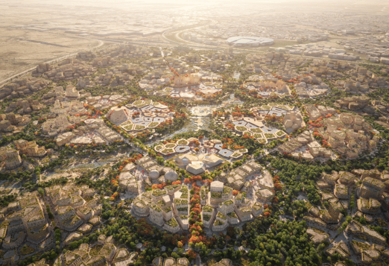 マスタープランは、ドイツの建築スタジオLAVA(Laboratory for Visionary Architecture)によって設計され、生態学的再生、歩きやすさ、適応的再利用を優先しています。会場は、リヤド郊外のワディ・アル・スライ渓谷(乾いた川床)の地形に触発されており、再生されたワディを基盤として有機的で相互接続された空間ネットワークを形成します。これにより、木陰の歩行者通路が整備され、自然冷却の微気候が育まれ、砂漠気候に対応する上で不可欠な要素となります。また、自然界に見られるパターンにインスパイアされたフラクタル幾何学を応用し、接続性の最適化と訪問者の効率的な移動を確保しています。