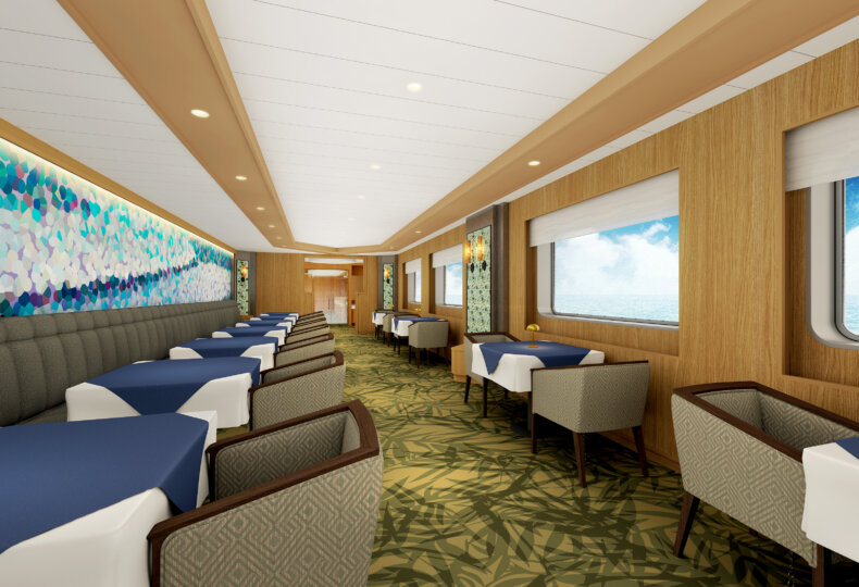 新造船「けやき」は「京都・歴史」をコンセプトに、上品で優雅、そして温かみのある船内デザインを追求しました。船内には3層吹き抜けのエントランス、シースルーエレベーター、2層吹き抜けのフォワードサロン「白竜」など、開放的な空間が広がります。 施設名には、百人一首や丹後ゆかりの名称が取り入れられており、オーセントホテル小樽監修のグリルレストラン「大江山」やレストラン「しゅてん」があります。 新造船ならではの大きな特長として、Starlinkを活用した有料のフェリーWi-Fiサービスが導入され、全客室で高速Wi-Fiが利用可能です。洋上での快適な通信が実現し、船上での過ごし方が広がります。